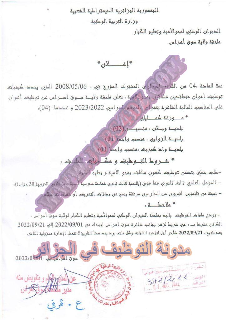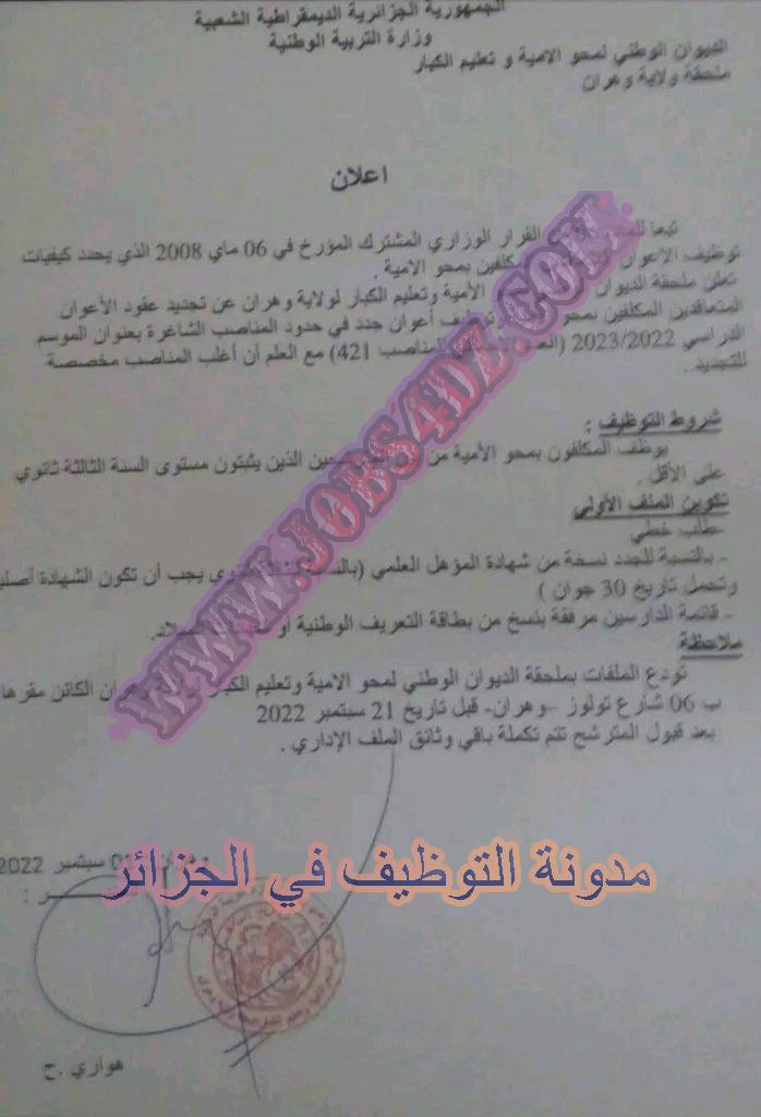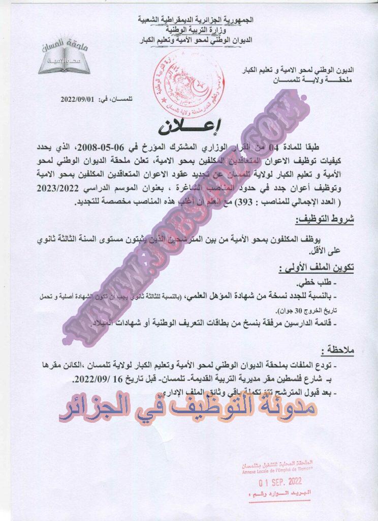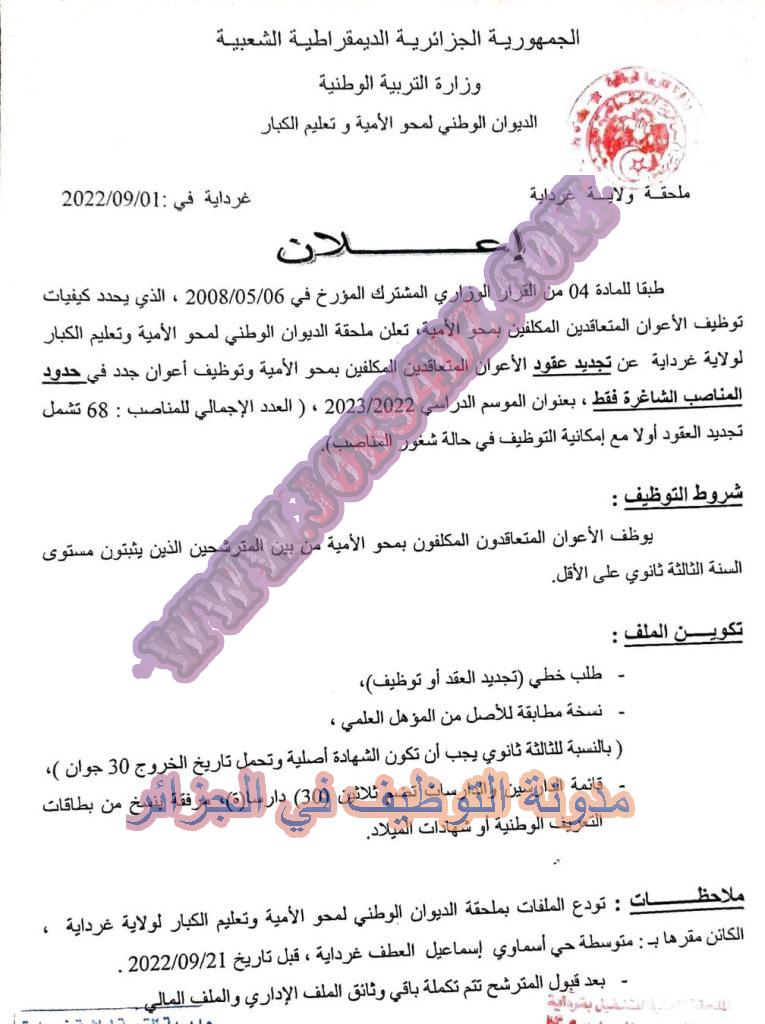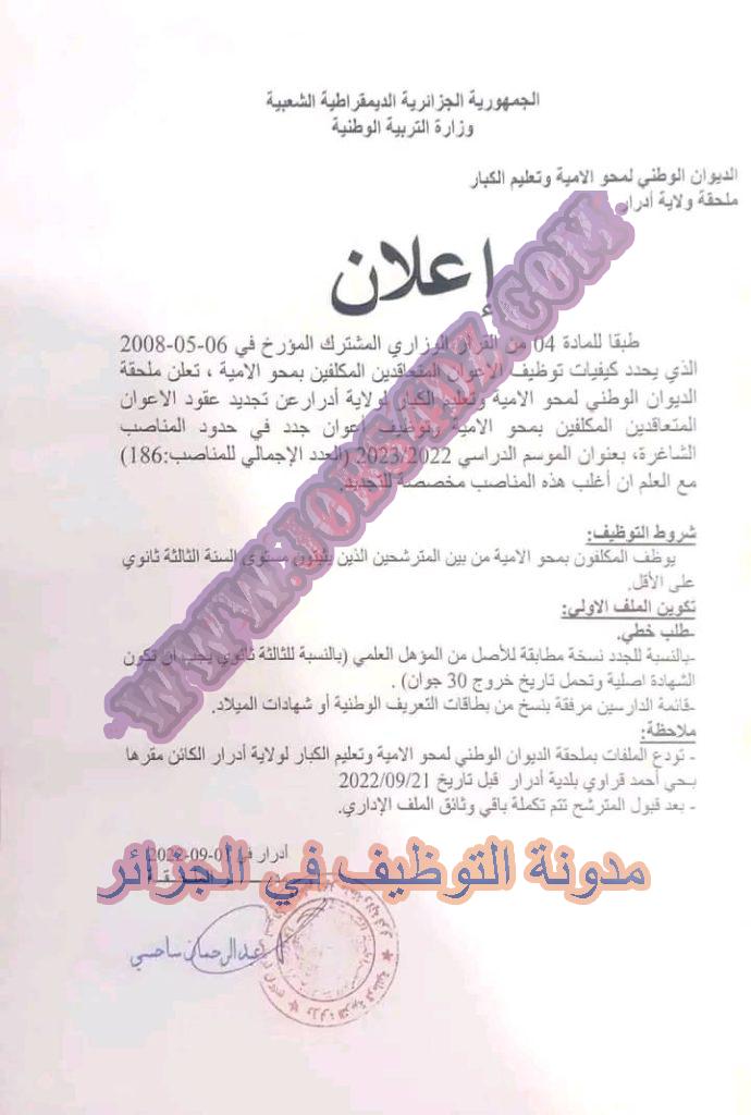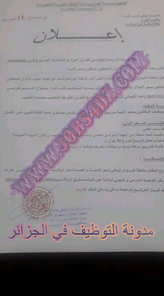يعلن الديوان الوطني لمحو الأمية وتعليم الكبار عن فتح توظيف بولايات التالية النعامة جيجل وهران غرداية عين تيموشنت بشار الجلفة تبسة المدية أدرار سوق أهراس تمنراست الطارف تلمسان بسكرة عن فتح توظيف الأعوان المتعاقدين المكلفين بالمحو الأمية في الحدود المناصب شاغرة بعنوان سنة 2023/2022