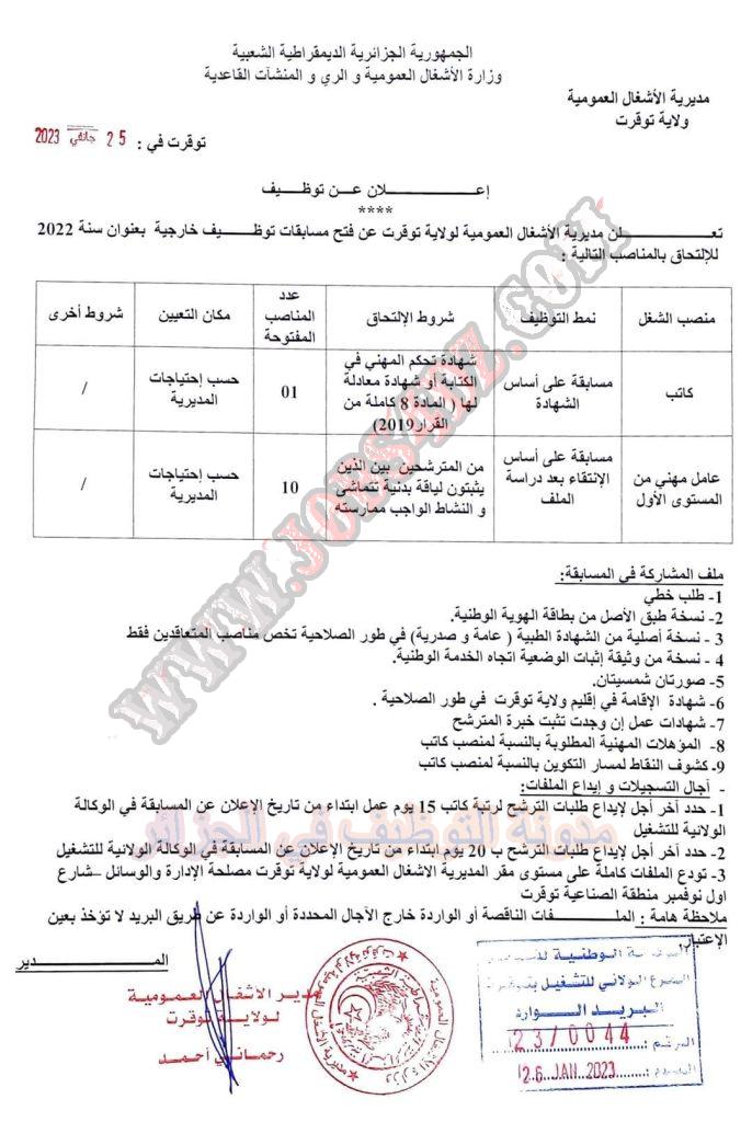 تعلن مديرية الاشغال العمومية لولاية توقرت عن فتح مسابقة توظيف على اساس الشهادة وعلى اساس الانتقاء في الرتب المبينة ادناه