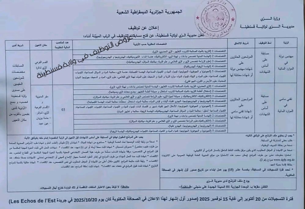 تعلن مديرية الري لولاية قسنطينة، عن فتح مسابقة التوظيف في الرتب المبينة أدناه: