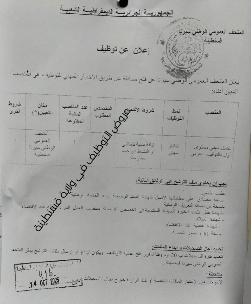 يعلن المتحف الوطني العمومي سيرتا عـن فـتـح مسابقة عن طريق الإختبار المهني للتوظــف في المنصب التالي: