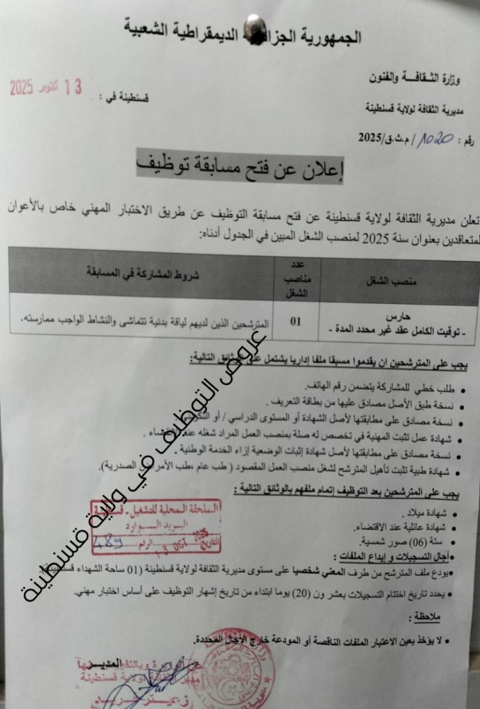 تعلن مديرية الثقافة لولاية قسنطينة عن فتح مسابقة التوظيف عن طريق الإختبار المهني الخاص بالأعوان المتعاقدين بعنوان سنة 2025 لمنصب الشغل المبين في الجدول أدناه: