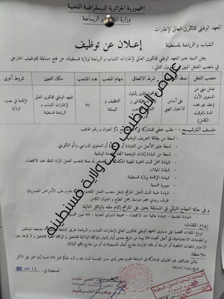 يعلن السيد مدير المعهد الوطني للتكوين العالي لإطارات الشباب والرياضة لولاية قسنطينة، عن فتح مسابقة للتوظيف الخارجي في المنصب الشاغل المبين في الجدول التالي: