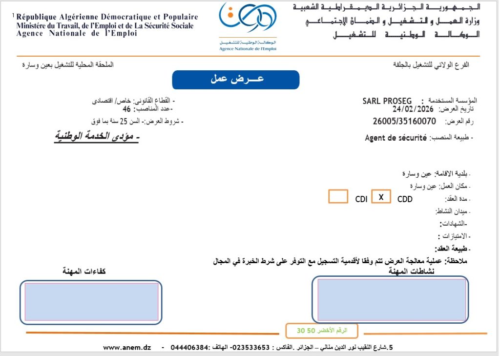 تعالج عروض التوظيف آليا عن طريق النظام المعلوماتي “وسيط” بالملحقة المحلية للتشغيل مكان العمل وفق شروط العمل المحددة من طرف المؤسسة