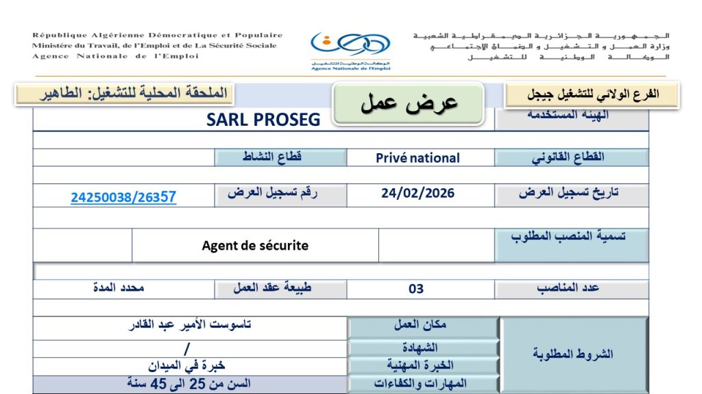 تعلن شركة SARL PROSEG، عن توظيف كالتالي :