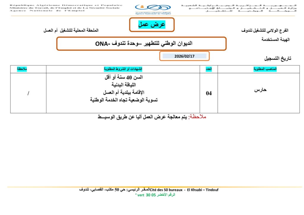 الهيئة المستخدمة: الديوان الوطني للتطهير – وحدة تندوف – ONA