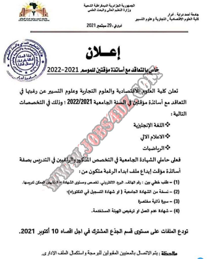 تعلن كلية العلوم الاقتصادية والعلوم التجارية وعلوم التسيير عن رغبتها في التعاقد مع اساتذة مؤقتين للسنة الجامعية 2021/2022 وذلك في التخصصات التالية