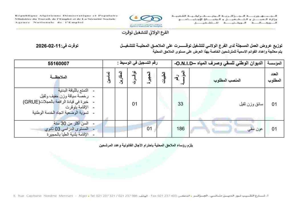 | الديوان الوطني للسقي وصرف المياه -O.N.I.D- | سائق وزن ثقيل | 01 |