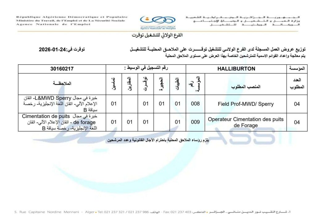 | 04 | Field Prof-MWD/ Sperry | 008 | 01 (الطيبات)، 01 (الحجيرة)، 01 (توقرت)، 01 (تماسين) |