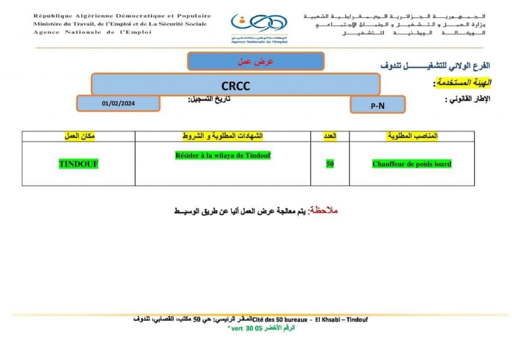 تعلن الملحقة المحلية للتشغيل تندوف عن عرض عمل بالشركة الصينية المحدودة لإنشاءات السكك الحديدية CRCC كما هو موضح ادناه