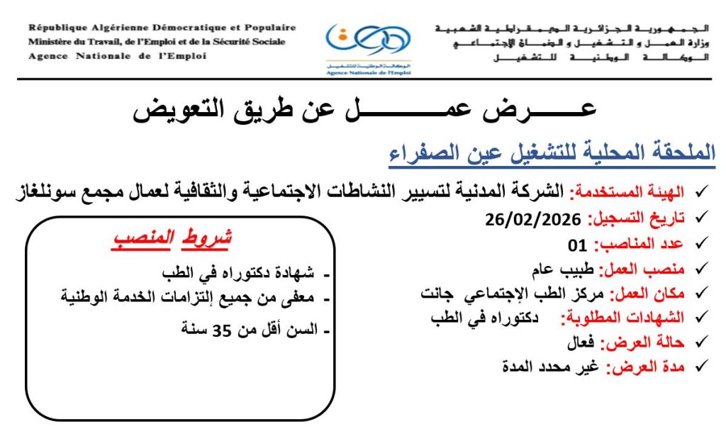 الهيئة المستخدمة: الشركة المدنية لتسيير النشاطات الاجتماعية والثقافية لعمال مجمع سونلغاز