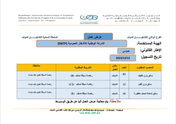 اعلان توظيف بالشركة الوطنية للأشغال الوطنية SNTP (سائقين) 25 منصب شاركها Facebook Twitter LinkedIn Pinterest الفرع الولائي للتشغيـل