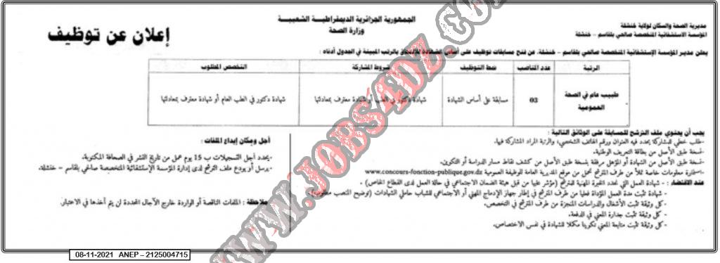 تعلن المؤسسة الإستشفائية المتخصصة صالحي بلقاسم خنشلة عن فتح مسابقات توظيف على اساس الشهادات في المناصب التالية