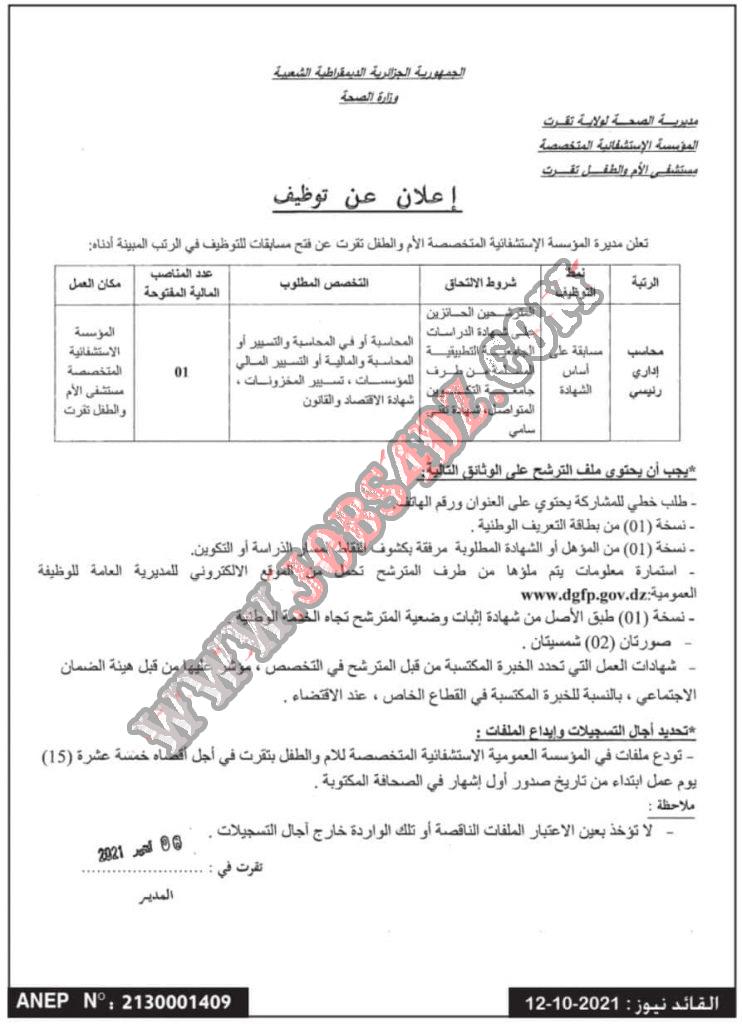 تعلن ادارة المؤسسة الاستشفائية المتخصصة الام والطفل تقرت عن فتح مسابقة للتوظيف على اساس الشهادة في المناصب التالية