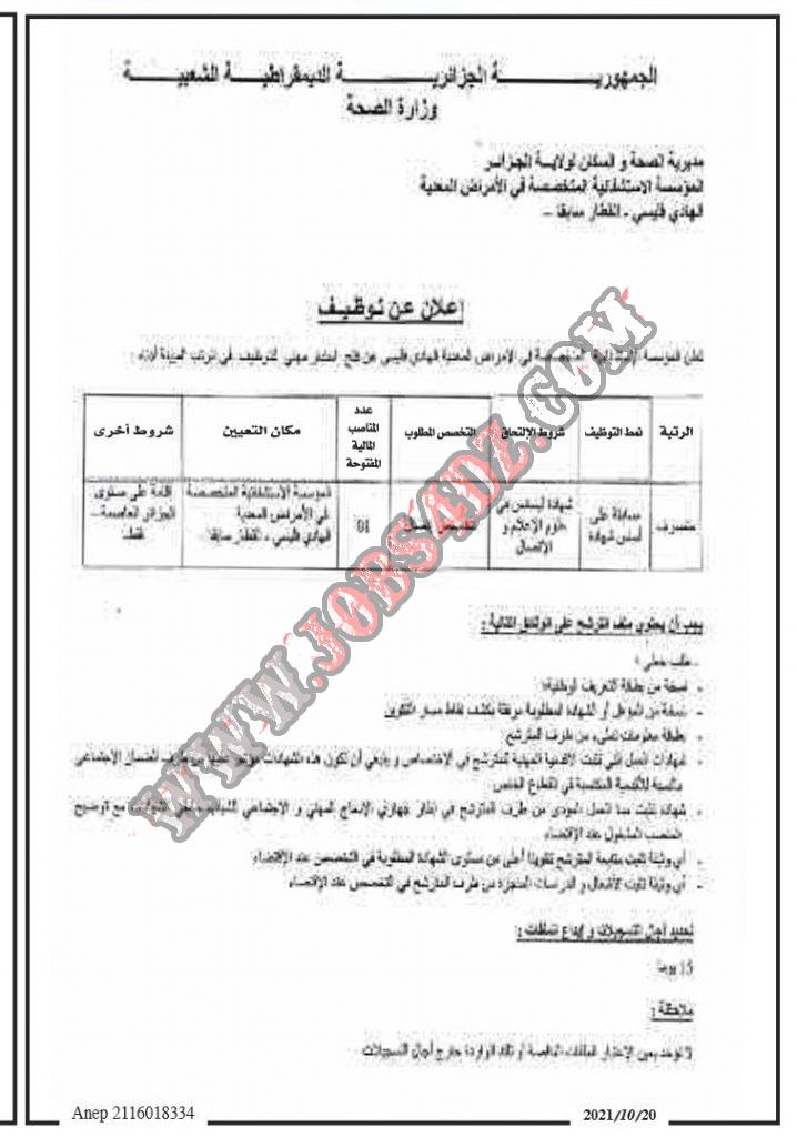 اعلان توظيف مناصب ادارية بالمؤسسة الاستشفائية المتخصصة في الأمراض المعدية العاصمة