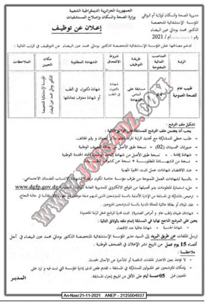 تعلن المؤسسة الاستشفائية المتخصصة الدكتور بومالي محمد عين البيضاء عن فتح مسابقة للتوظيف في الرتب المبينة ادناه لسنة 2021