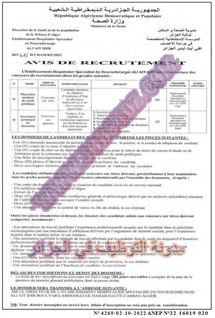 تعلن المؤسسة الاستشفائية المتخصصة في جراحة الاعصاب علي ايت ايدير بالجزائر العاصمة عن فتح مسابقة توظيف على اساس الشهادة الرتب المبينة ادناه