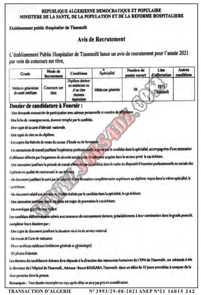 تعلن المؤسسة العمومية الاستشقائية بتيسمسيلت عن فتح توظيف للسنة المالية 2021 في المناصب التالية