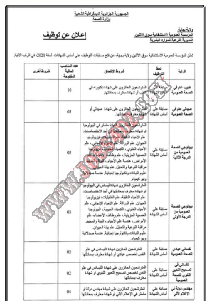 تعلن المؤسسة العمومية الاستشفائية سوق الاثنين ولاية بجاية عن فتح مسابقات توظيف على اساس الشهادة في المناصب التالية