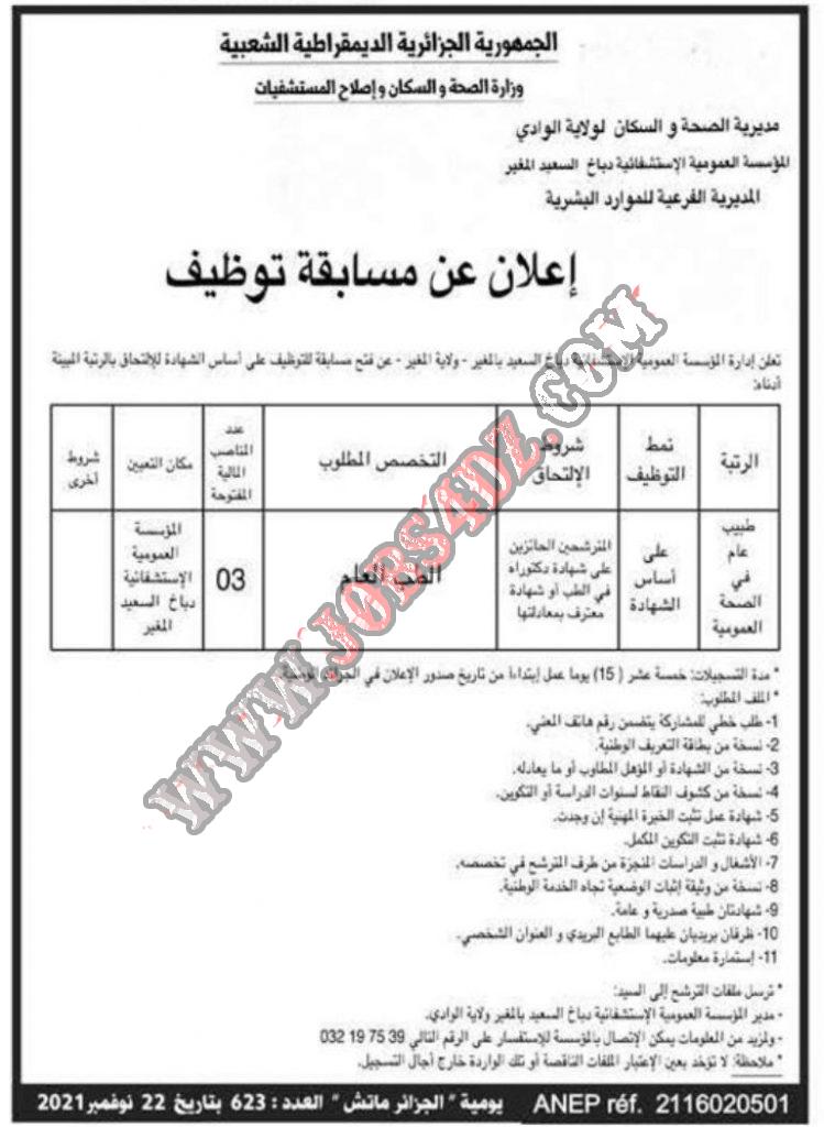 اعلان توظيف بالمؤسسة العمومية الاستشفائية دباخ السعيد ولاية المغير
