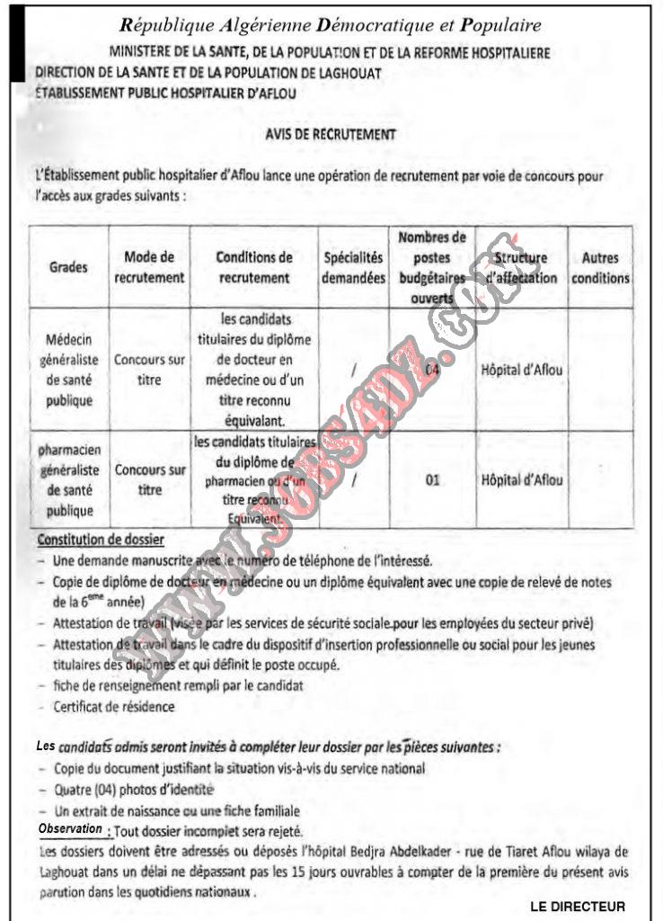 تعلن المؤسسة العمومية الاستشفائية افلو ولاية الاغواط عن فتح مسابقة توظيف على اساس الشهادات في المناصب التالية