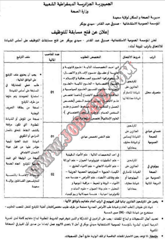 تعلن المؤسسة العمومية الاستشفائية صدوقي عبد القادر سيدي بوبكر ولاية سعيدة عن فتح مسابقة توظيف على اساس الشهادة في المناصب التالية