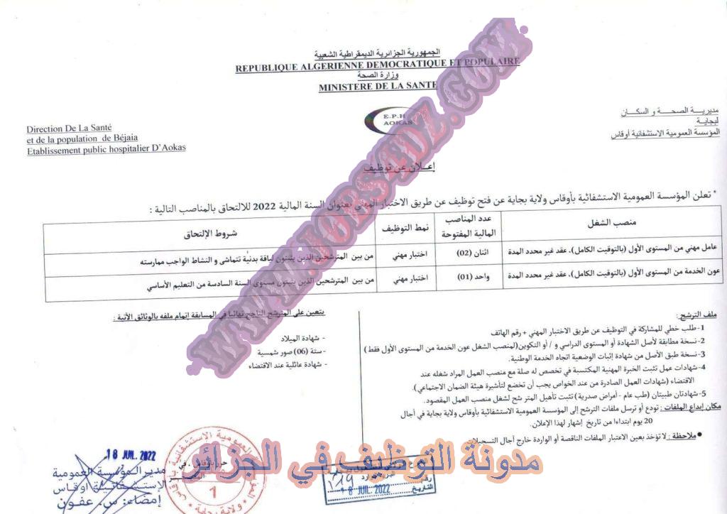 تعلن المؤسسة العمومية الاستشفائية باوقاس ولاية بجاية عن فتح مسابقة توظيف على اساس الاختبار المهني بعنوان السنة المالية 2022 في المناصب المبينة ادناه