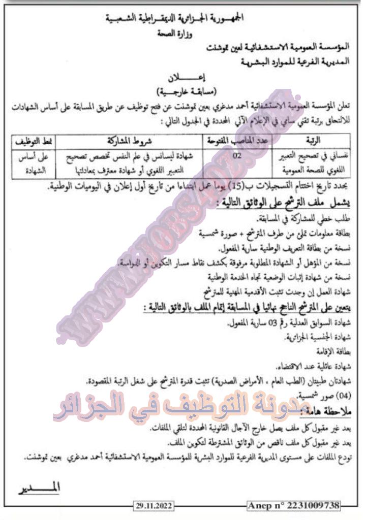 تعلن المؤسسة العمومية الاستشفائية احمد مدغري بعين تموشنت عن فتح مسابقة توظيف على اساس الشهادة في الرتب المبينة ادناه