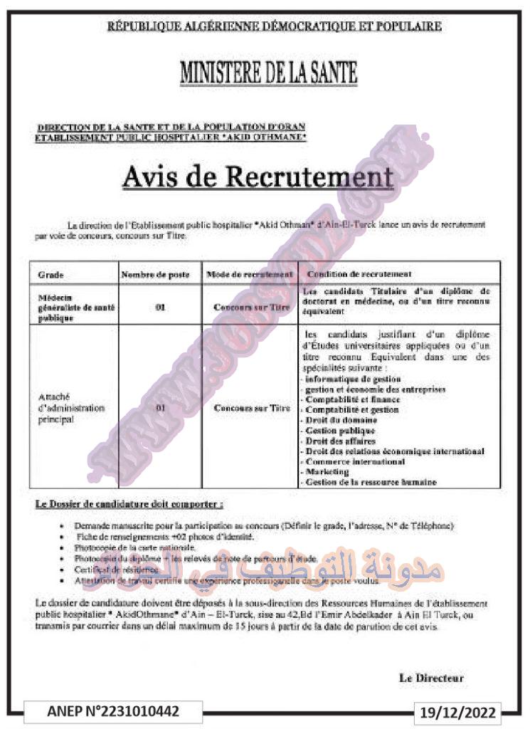 تعلن المؤسسة العمومية الاستشفائية العقيد عثمان عين الترك عن فتح مسابقة توظيف على اساس الشهادة في الرتب المبينة ادناه