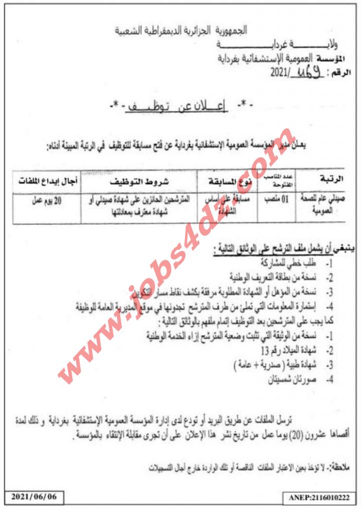 اعلان توظيف بالمؤسسة العمومية الاستشفائية بغرداية