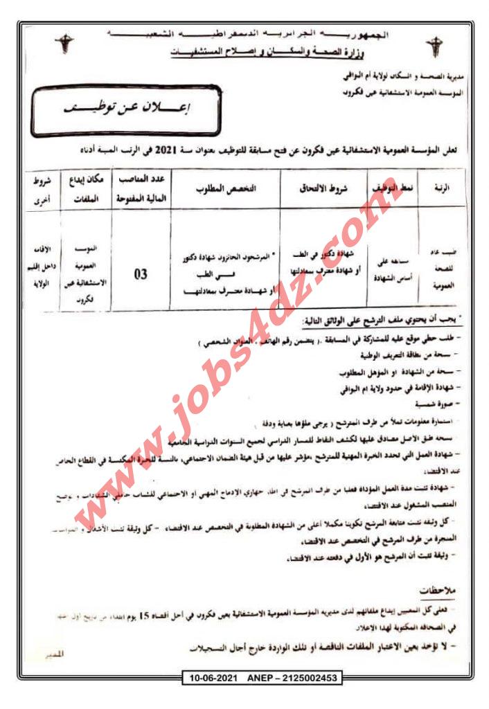 تعلن المؤسسة العمومية الاستشفائية عين فكرون عن فتح مسابقة للتوظيف بعنوان سنة 2021 في الرتب المبينة ادناه