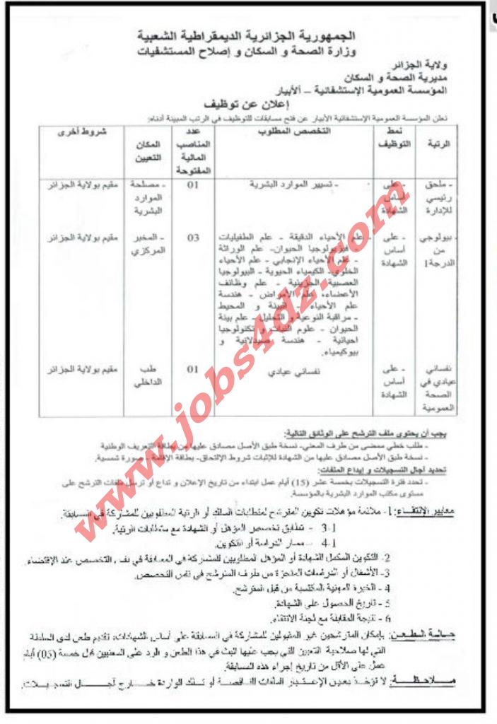 تعلن المؤسسة العمومية الاستشفائية الابيار عن فتح مسابقات للتوظيف في الرتب المبينة ادناه