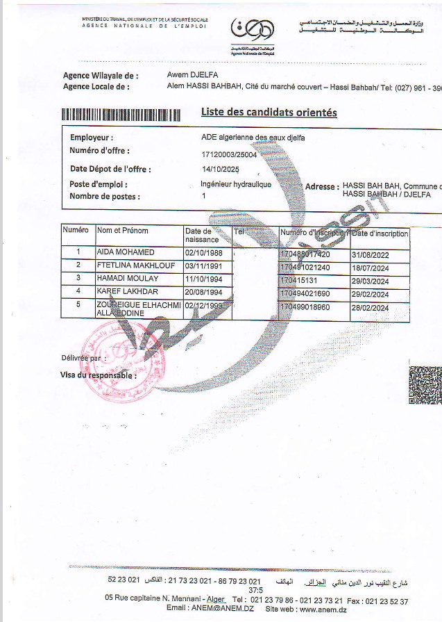 شروط العرض: شهادة مهندس أو ماستر في الري – السن أقل من 45 سنة – الإقامة بحاسي بحبح