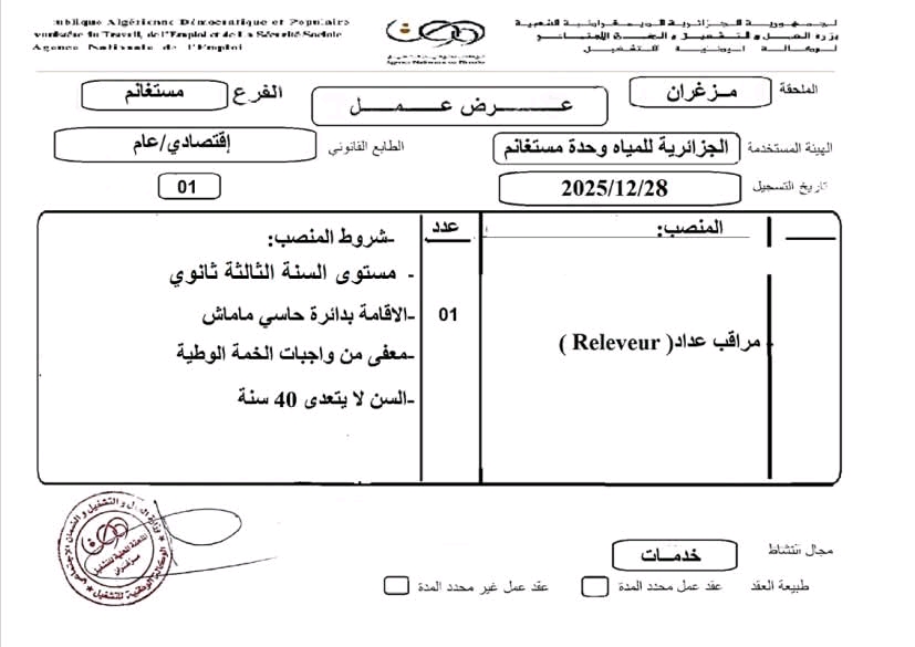 الهيئة المستخدمة: الجزائرية للمياه وحدة مستغانم