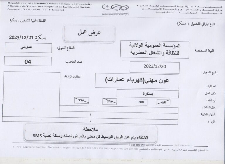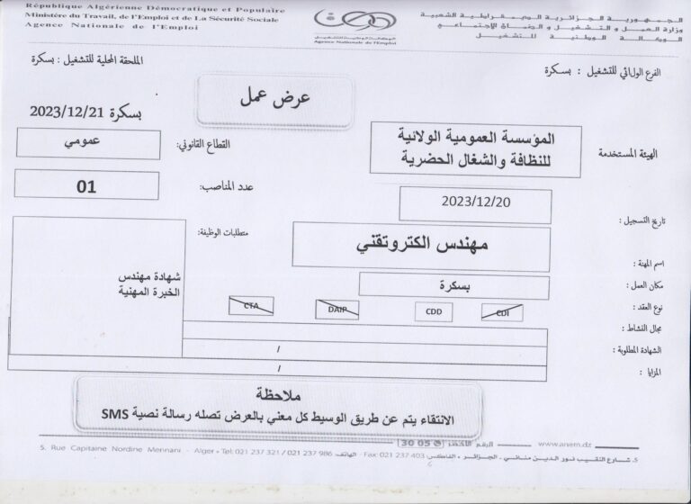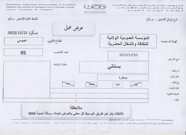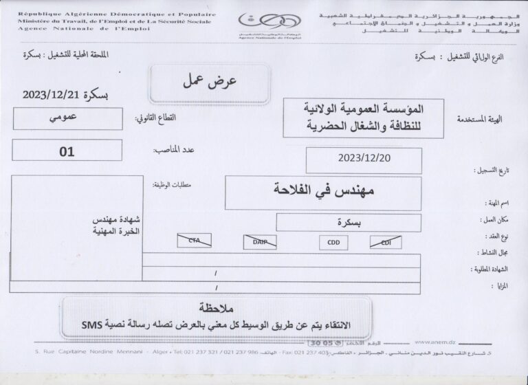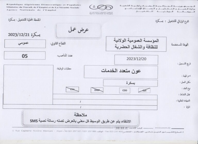 ملاحظة : العرض تم نشره على مستوى الملحقة المحلية للتشغيل بسكرة