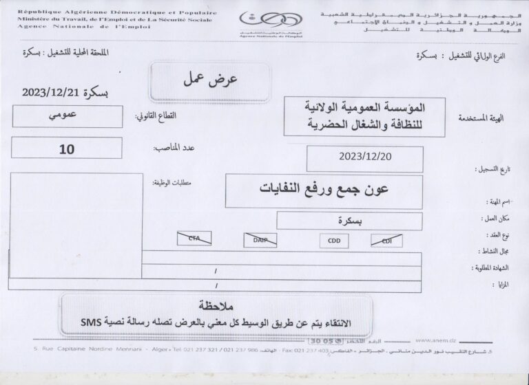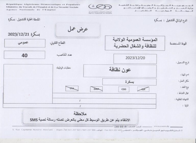 تعلن الملحقة المحلية للتشغيل بسكرة عن عرض عمل بالمؤسسة العمومية الولائية للنظافة والشغل الحضارية كما هو موضح ادناه