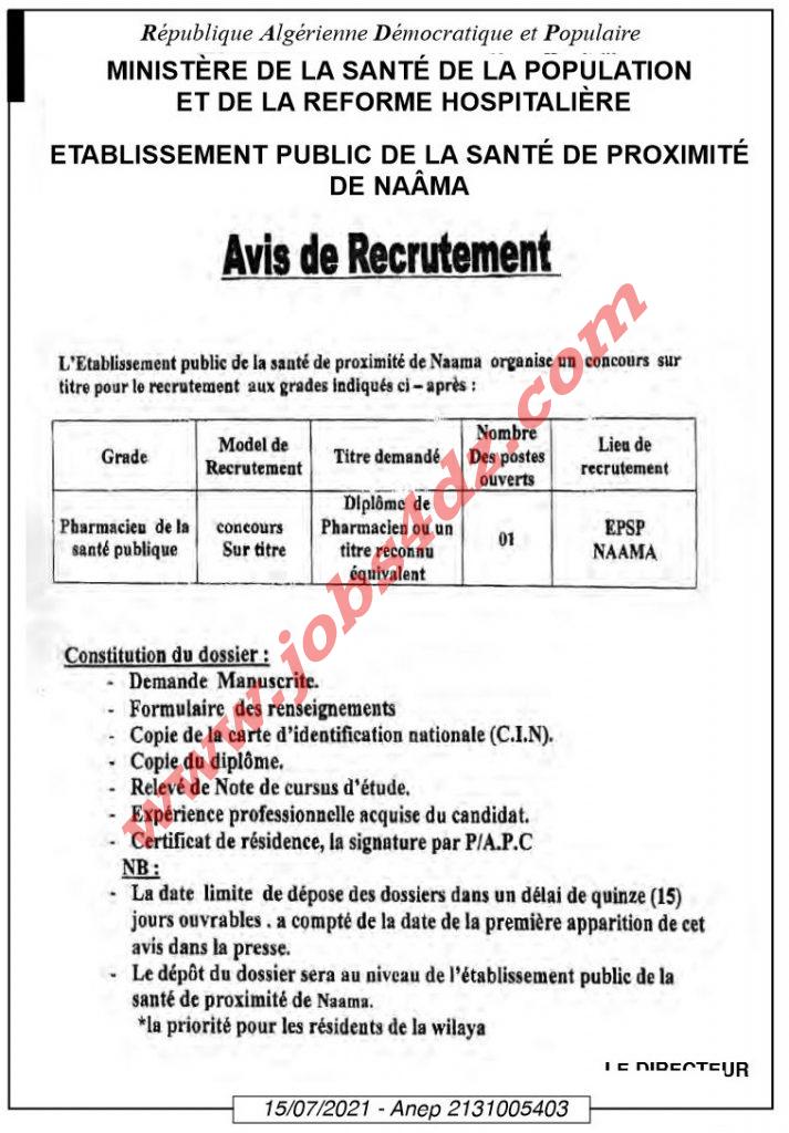 اعلان توظيف بالمؤسسة العمومية للصحة الجوارية النعامة عن فتح مسابقة توظيف في المناصب التالية
