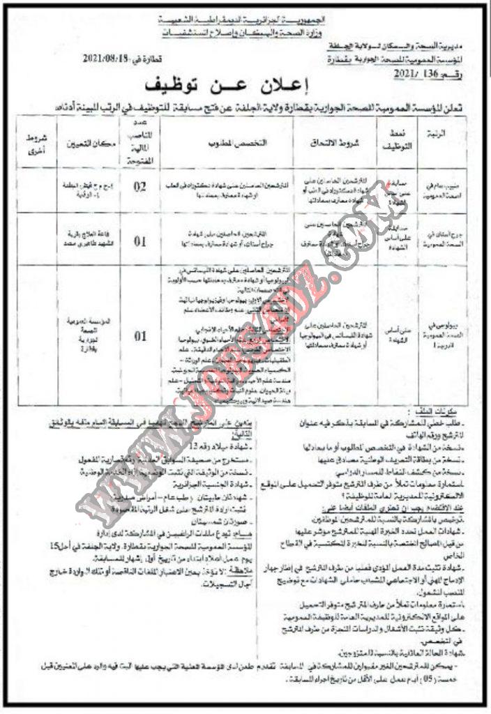 تعلن المؤسسة العمومية للصحة الجوارية بقطارة ولاية الجلفة عن فتح مسابقة للتوظيف في الرتب المبينة ادناه