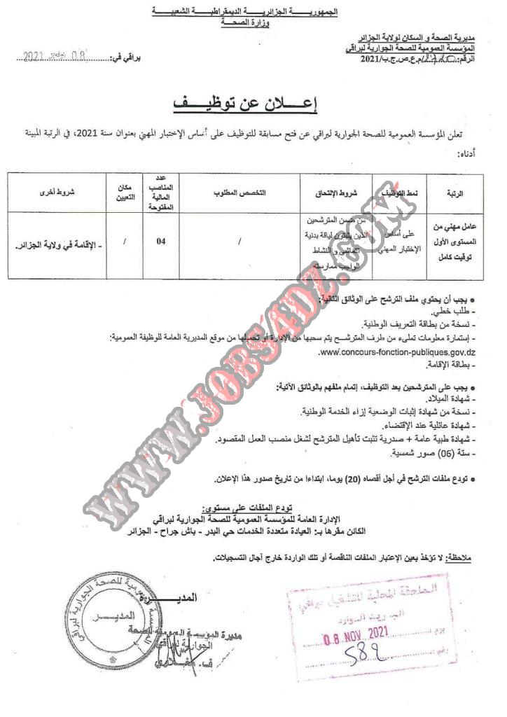 تعلن المؤسسة العمومية للصحة الجوارية لبراقي عن فتح مسابقة للتوظيف على اساس الاختبار المهني بعناون سنة 2021 في الرتبة المبينة ادناه