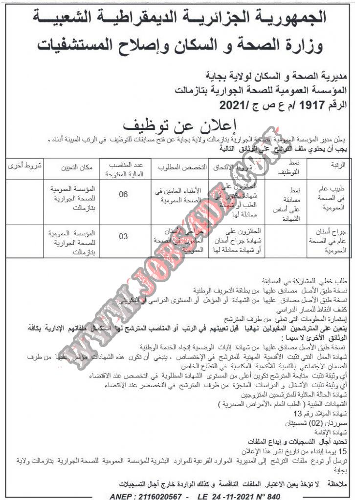 يعلن مدير المؤسسة العمومية للصحة الجوارية بتازمالت ولاية بجاية عن فتح مسابقات للتوظيف في الرتب المبينة أدناه