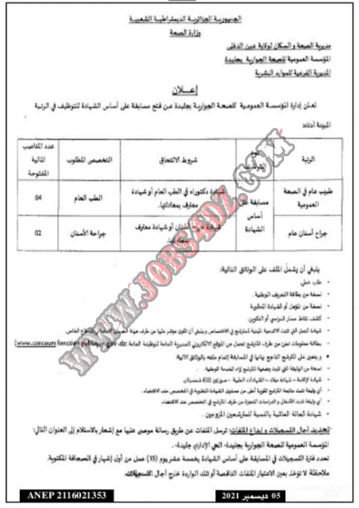 تعلن المؤسسة العمومية للصحة الجوارية بجليدة عين الدفلى عن فتح مسابقة توظيف على اساس الشهادات في المناصب التالية