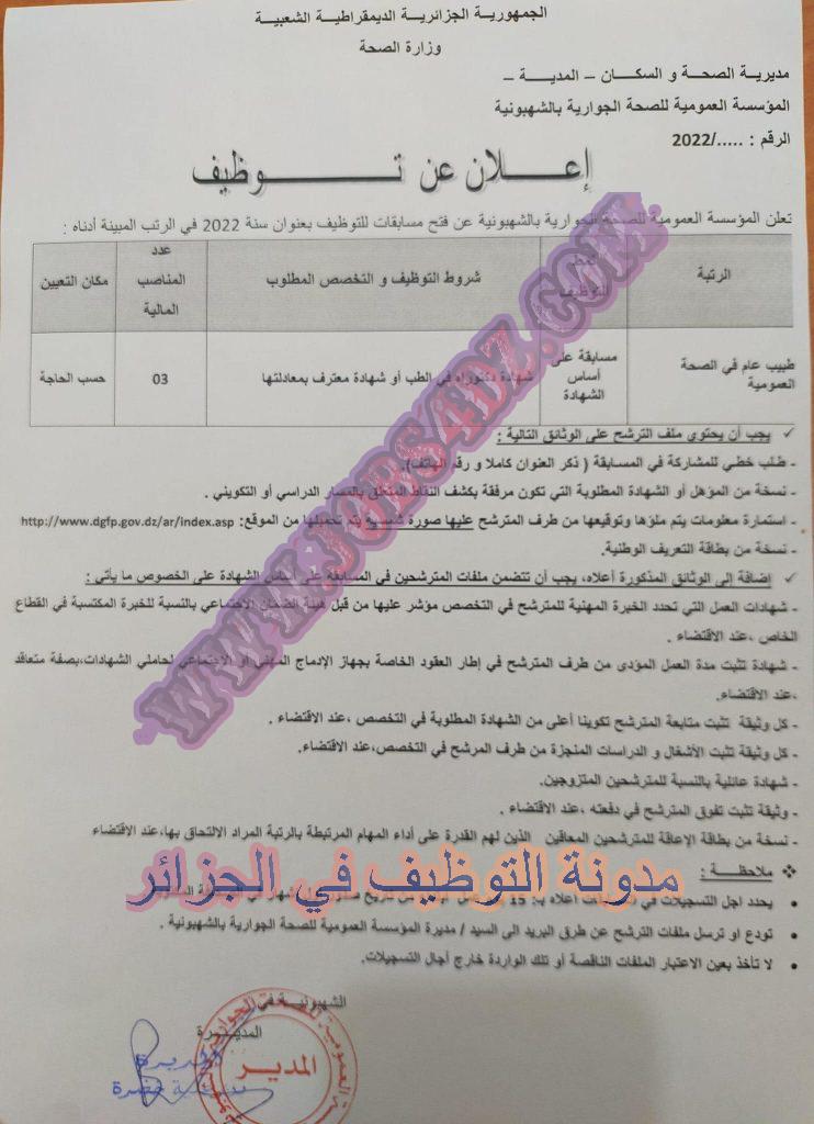 تعلن المؤسسة العمومية للصحة الجوارية بالشهيونية المدية عن فتح مسابقة توظيف على اساس الشهادة بعنوان السنة المالية 2022 في المناصب المبينة ادناه