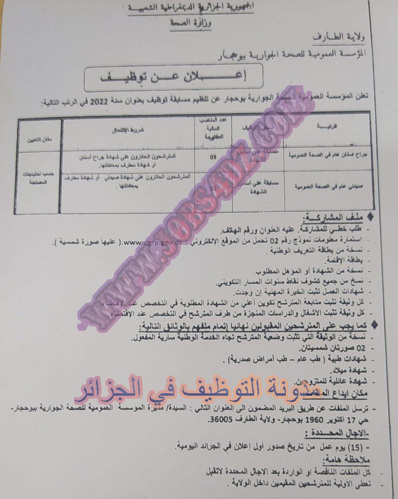 تعلن المؤسسة العمومية للصحة الجوارية بوحجار ولاية الطارف عن فتح مسابقة توظيف على اساس الشهادة بعنوان السنة المالية 2022 في المناصب المبينة ادناه