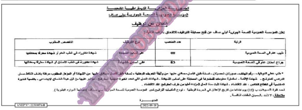 تعلن بالمؤسسة العمومية للصحة الجوارية بني صاف عن فتح مسابقة توظيف على اساس الشهادة في الرتب المبينة ادناه