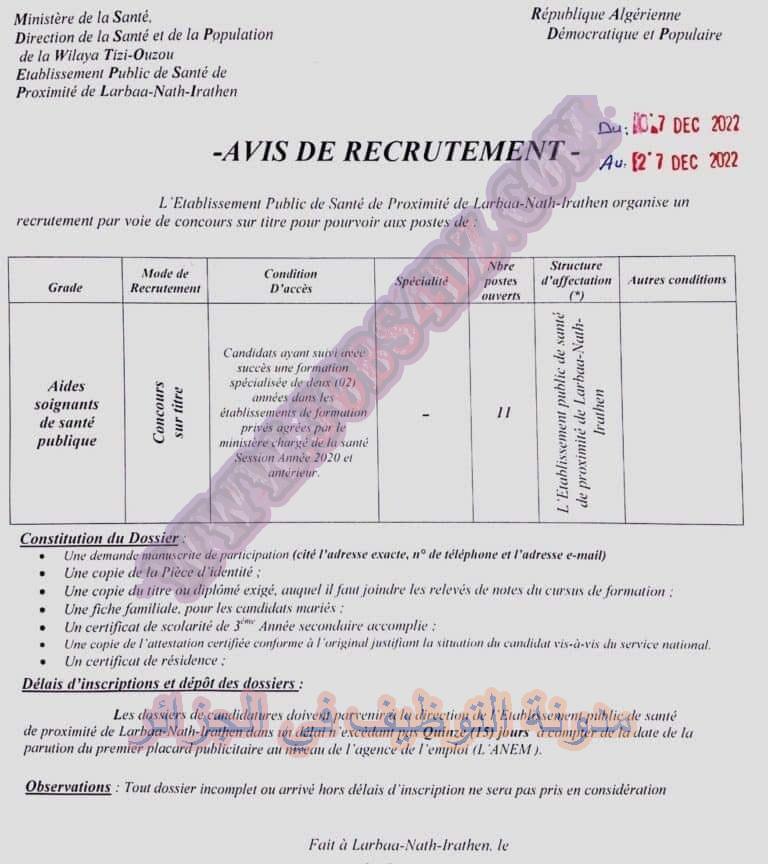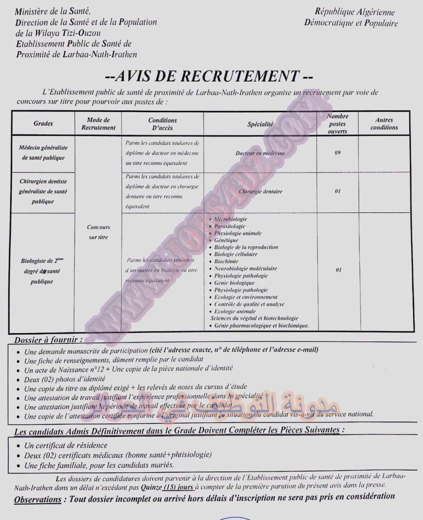 تعلن المؤسسة العمومية للصحة الجوارية لربعاء ناث ايراثن تيزي وزو عن فتح مسابقة توظيف في الرتب المبينة ادناه