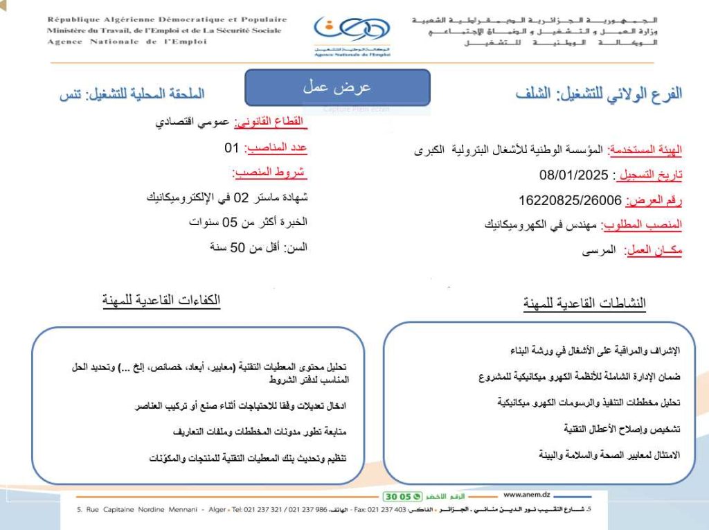الهيئة المستخدمة: المؤسسة الوطنية للأشغال البترولية الكبرى
