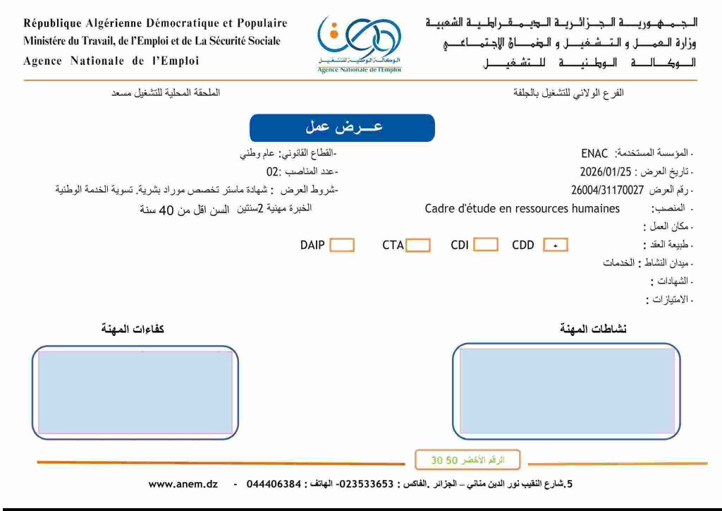 Cadre d’étude en ressources humaines0226004/31170027شهادة ماستر تخصص موارد بشرية، تسوية الخدمة الوطنية، الخبرة مهنية 2 سنتين، السن أقل من 40 سنة.