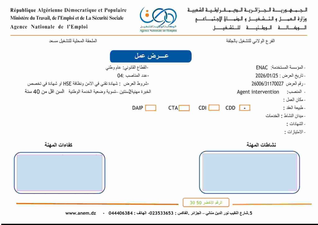 Agent intervention0426006/31170027شهادة تقني في الأمن ونظافة HSE أو شهادة في تخصص، الخبرة مهنية 2 سنتين، تسوية وضعية الخدمة الوطنية، السن أقل من 40 سنة.