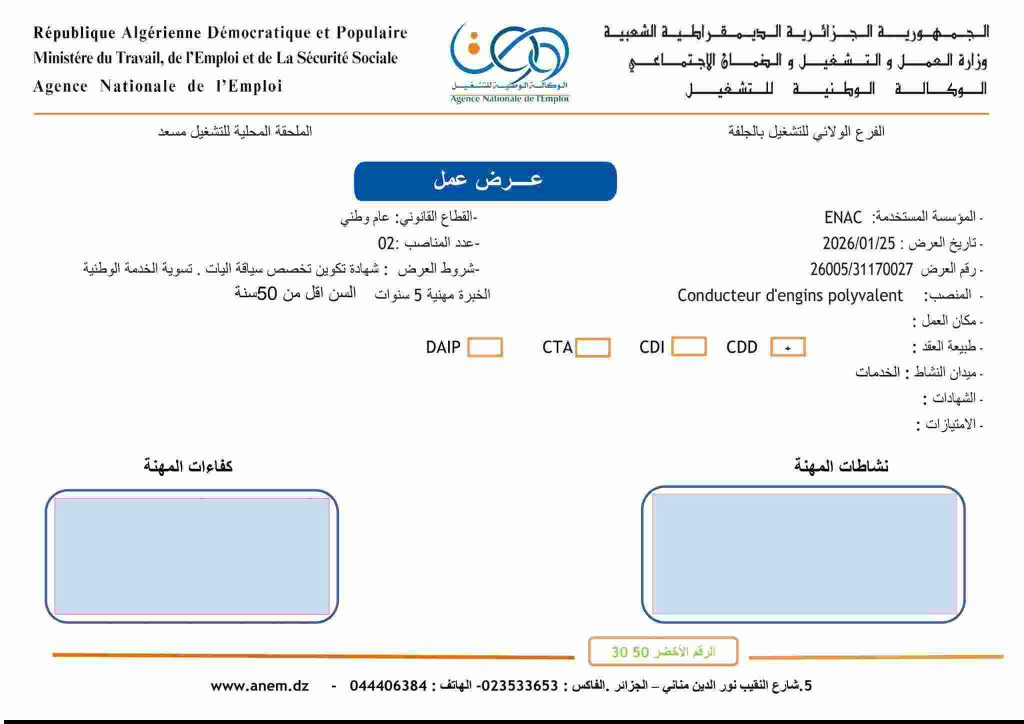 Conducteur d’engins polyvalent0226005/31170027شهادة تكوين تخصص سياقة آليات، تسوية الخدمة الوطنية، الخبرة مهنية 5 سنوات، السن أقل من 50 سنة.