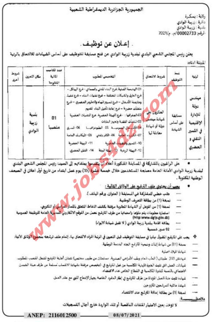 يعلن رئيس المجلس الشعبي البلدي لبلدية زريبة الوادي عن فتح مسابقة توظيف على اساس الشهادات في المناصب التالية