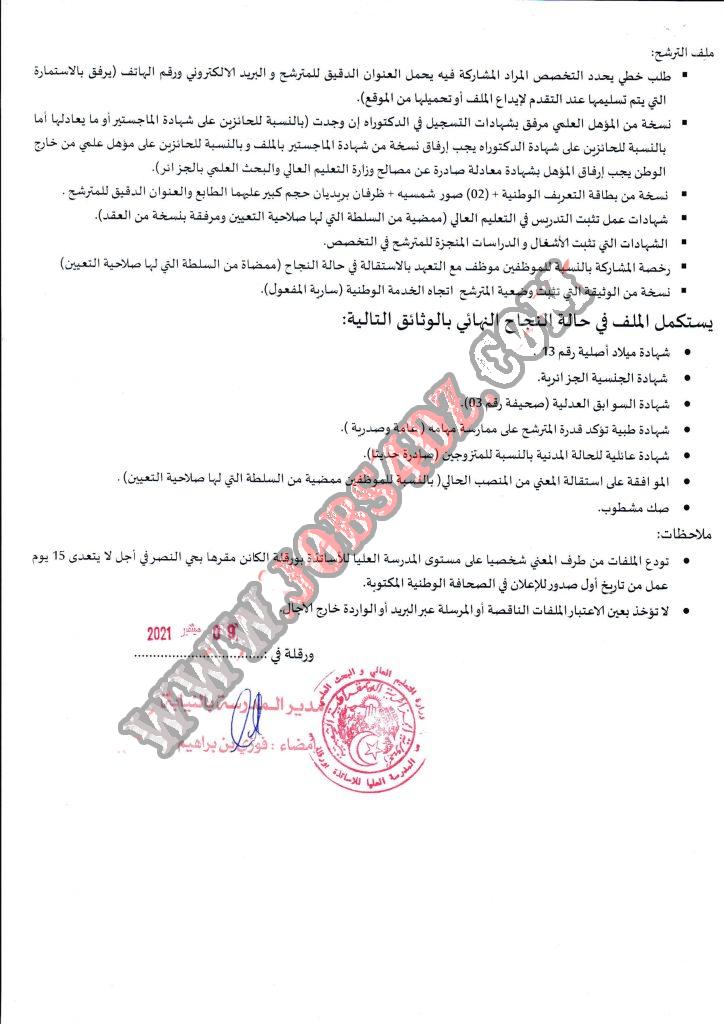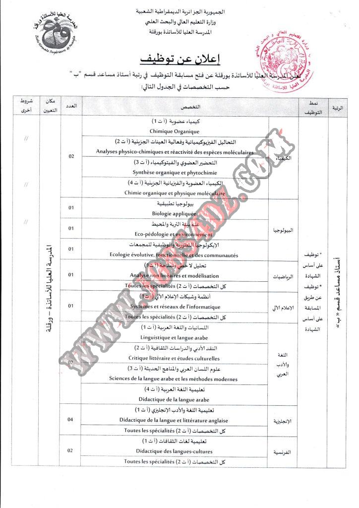تعلن المدرسة العليا للاساتذة ورقلة عن فتح مسابقة للتوظيف على اساس الشهادة للسنة المالية 2021 في الرتب التالية